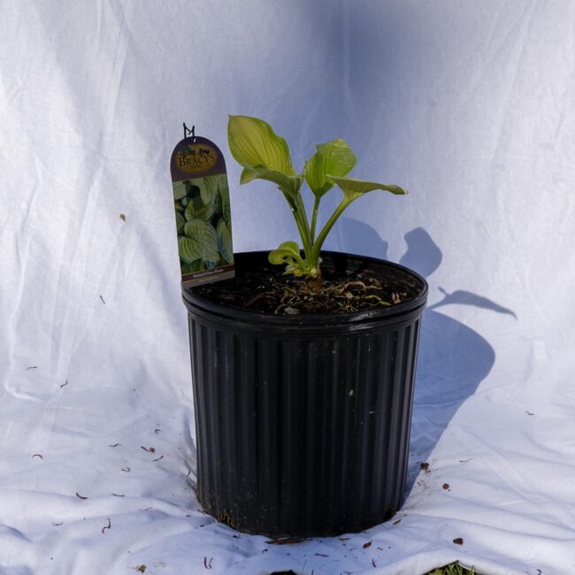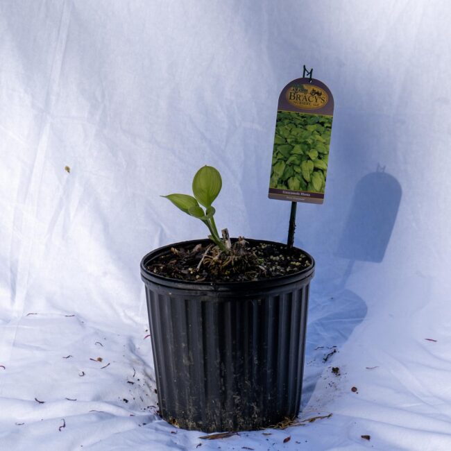 Stained Glass Hosta with lavender blooms in 3 gallon container.